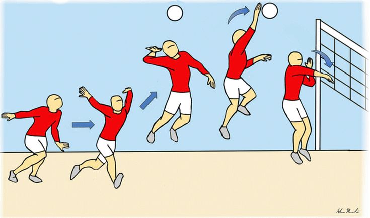O jogador deve ficar alguns passos afastado da linha de fundo, mandar a bola para cima e para frente, correr, saltar e bater na bola com a palma da mão com a maior potência possível.